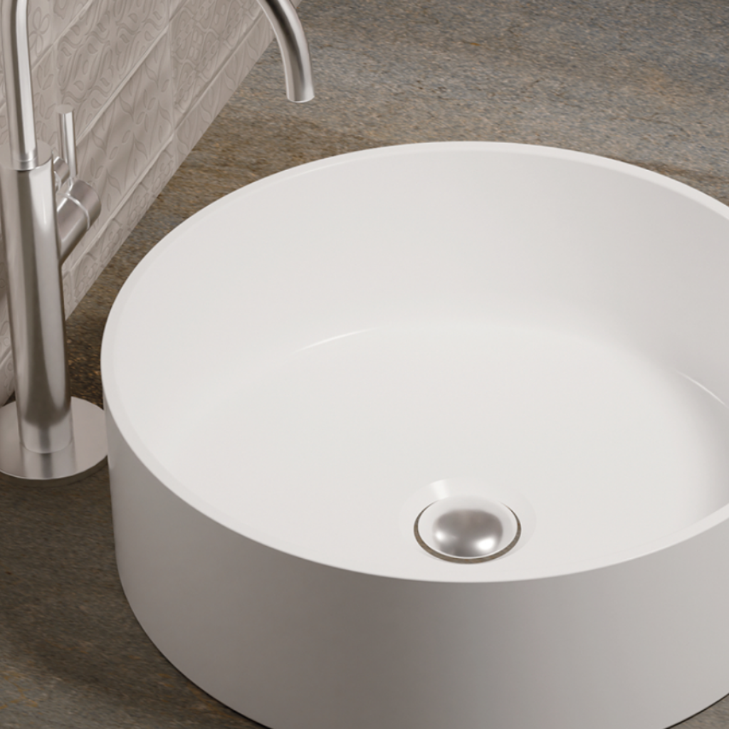 Rin es un lavabo sobre encimera que no pasará desapercibido gracias a su elegante diseño con forma circular y su textura lisa, Con todos los beneficios de nuestra superficie sólida, destaca por su enorme versatilidad, convirtiéndose en una herramienta para el diseño de baños modernos al servicio de interioristas y arquitectos
